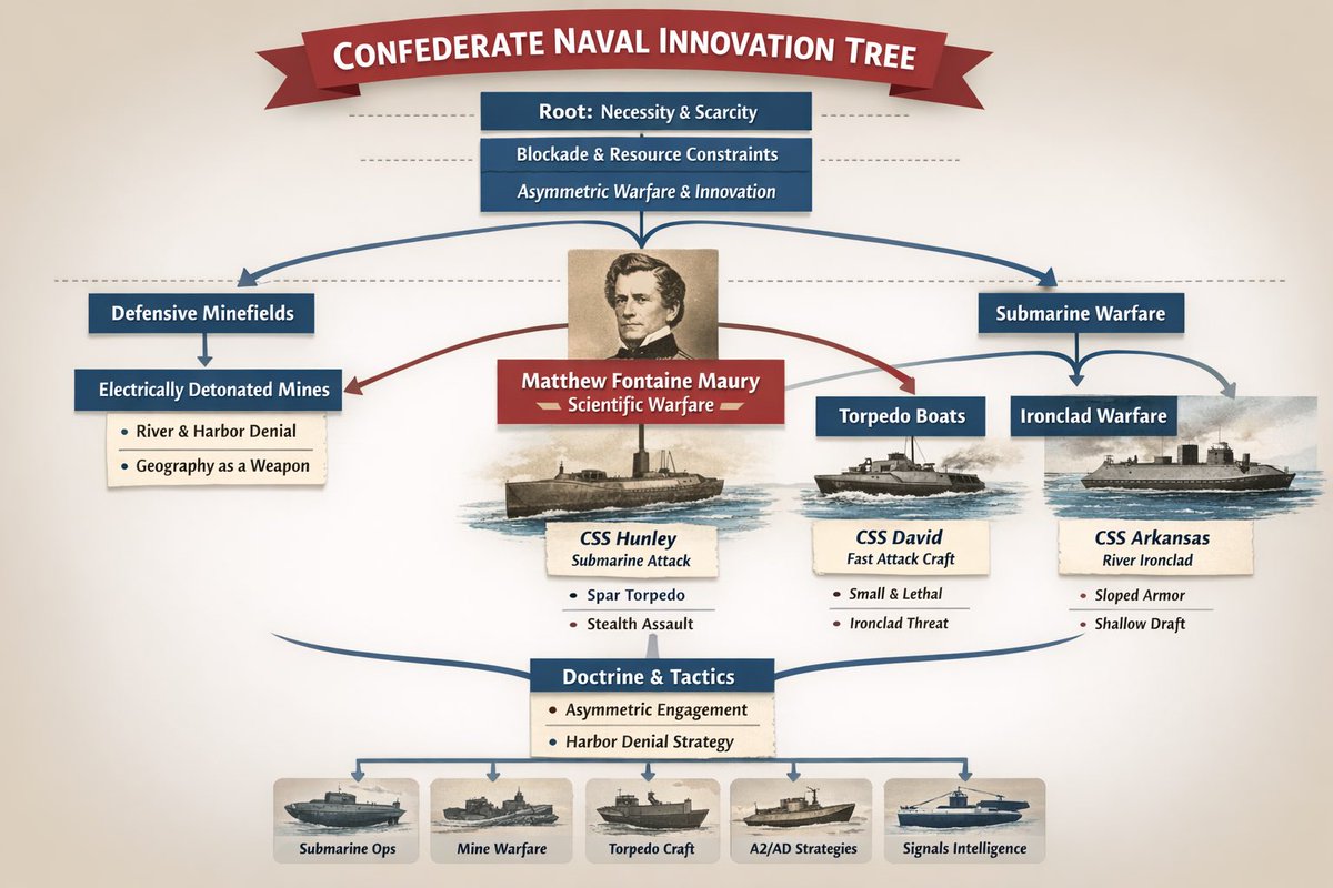 2/ At the top of it all was Matthew Fontaine Maury. Oceanographer, scientist, and strategist. He helped turn rivers and harbors into weapons, mapping currents and depths to place mines where they would do the most damage.