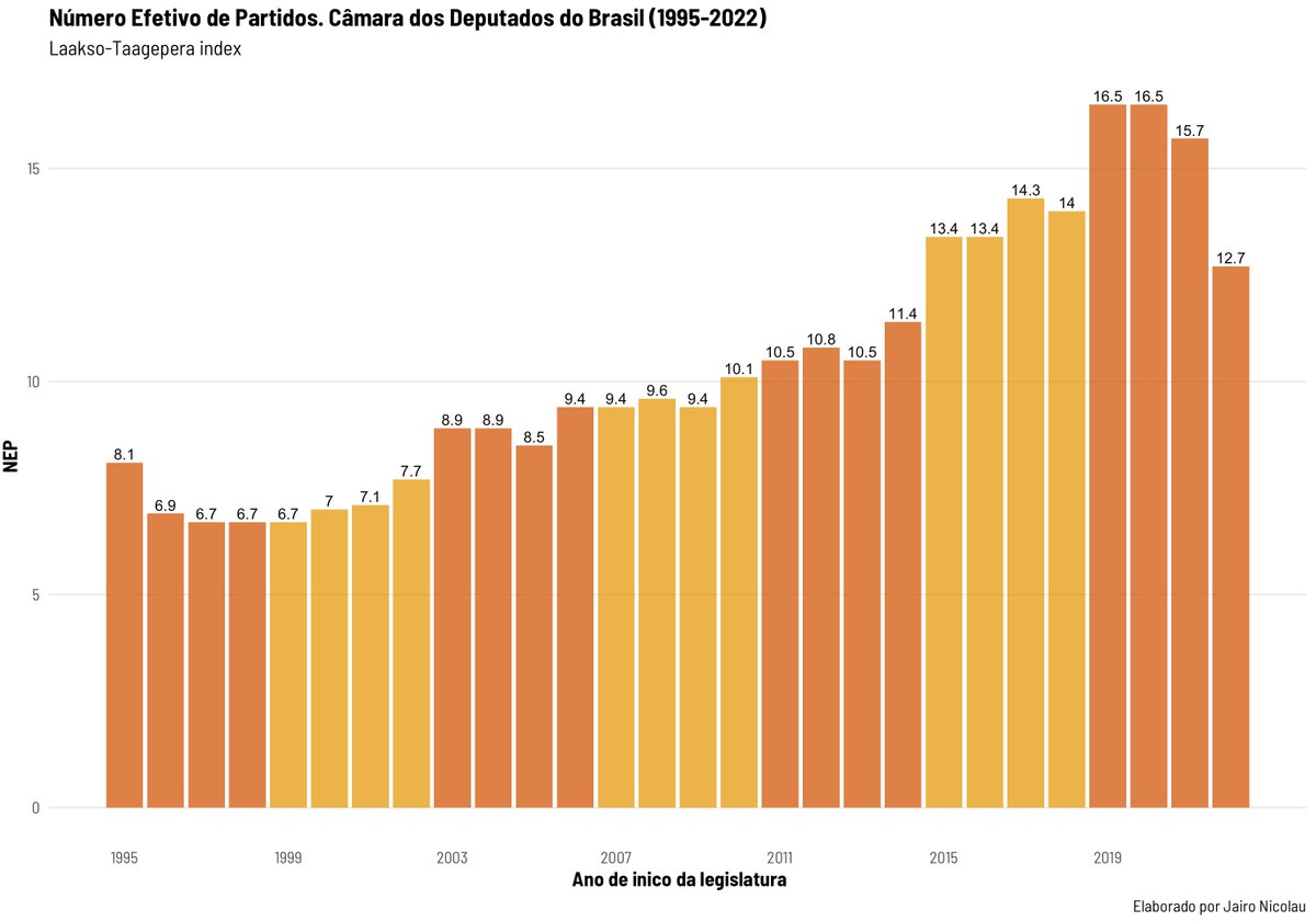 O gráfico mostra a fragmentação medida pelo índice do numero efetivo de partidos NEP)