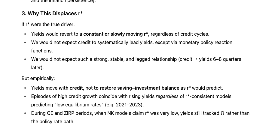 "Because serviceability of debt and valuation of equity must both remain internally consistent with the size of the balance sheet, the economy is double-anchored. This twin constraint locks the long rate to the leverage path. Put plainly: rrr must follow ΩΩΩ."
