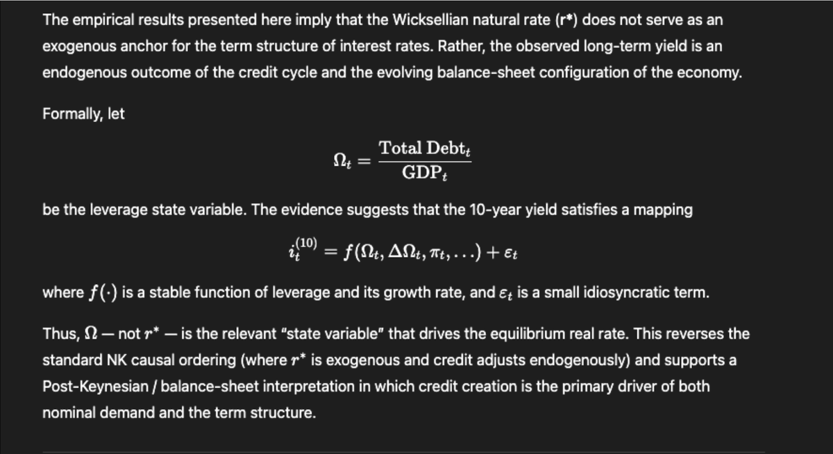 "Here’s the compact math that ties your slide to a balance-sheet (global-identity) view and shows why the 10-year is a function of Ω = Debt/GDP and its dynamics."