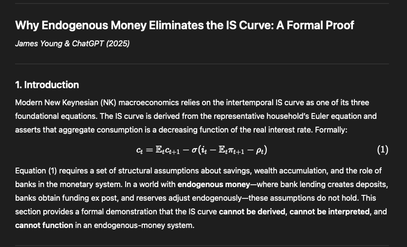 @FlorinBilbiie The proof proceeds by showing that each of these assumptions is violated in an endogenous-money framework, thereby invalidating the Euler equation at the aggregate level and eliminating the IS curve.