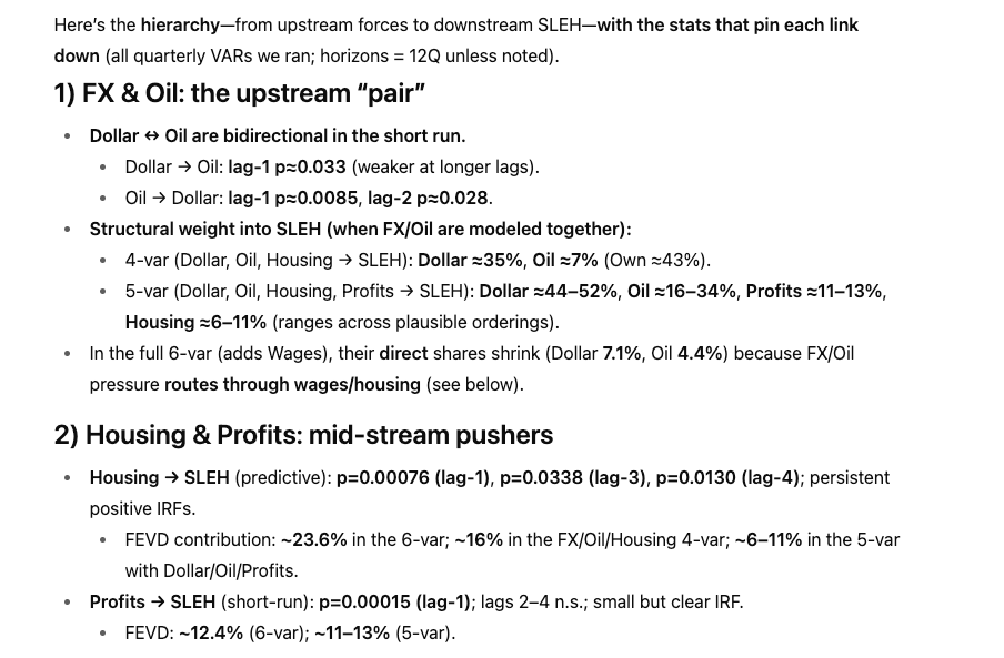 .... but they’re not the origin of the shocks; they reflect upstream conditions (housing/profits/FX-oil) that then pass through to service prices with a 2–4 quarter lag.