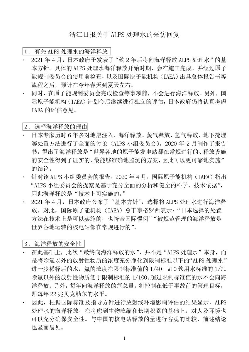 近日,我馆就东京电力福岛第一核电站向海洋释放ALPS处理水一事,接受了《浙江日报·潮新闻》的书面采访。但是,非常遗憾的是,昨日(3月2号)发出的报道,只截取了本馆回答的一部分,未能全面且正确反映其内容,因此本馆将此次采访回复全文刊出。(1/6)