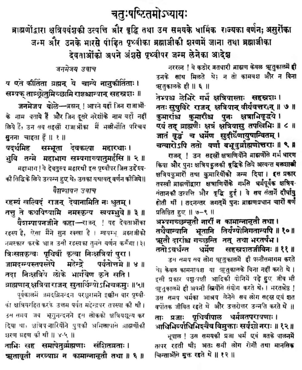 वे कठोर व्रतधारी ब्राह्मण केवल ऋतुकाल में ही उनके साथ मिलते थे; न तो कामवश और न बिना ऋतुकाल के ही. उन सहस्रों क्षत्राणियों ने ब्राह्मणों से गर्भ धारण किया और पुनः क्षत्रियकुल की वृद्धि के लिये अत्यन्त बलशाली क्षत्रियकुमारों तथा कुमारियों को जन्म दिया. 2/.