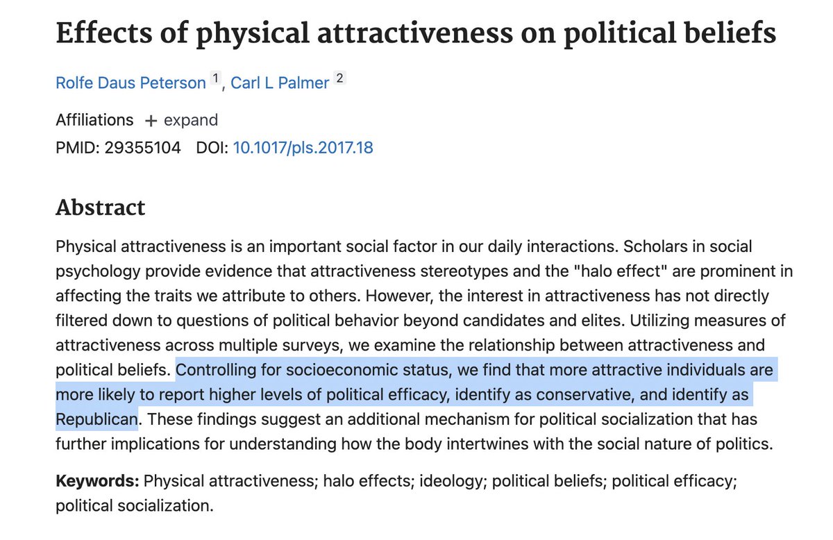 Selon une étude publiée en 2017, les individus les moins physiquement attractifs (les plus laids) ont davantage tendance à être de gauche.