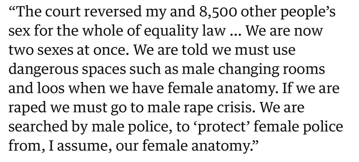 https://twitter.com/salltweets/status/18794497899911336802/ As matters stand in Australian law, sex is not immutable and can be changed in law without resort to even a gender recognition certificate equivalent because of the wide and circular definition of gender identity. Appearances have more rights than bodies.