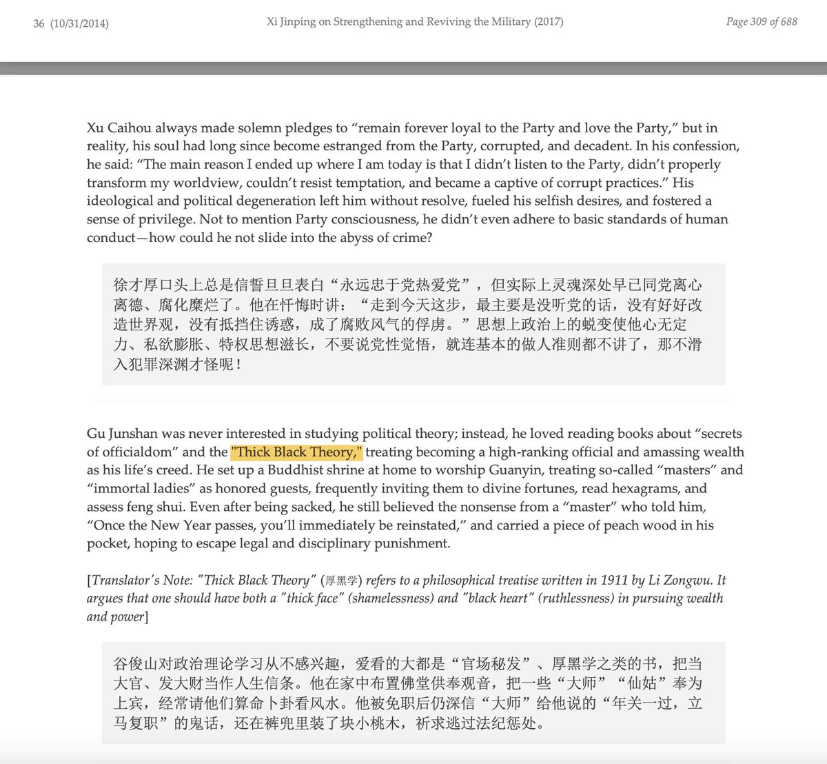 Gu Junshan, then Deputy Director of the General Logistics Department, was one senior most PLA officials brought down in Xi's initial corruption campaign. In a speech made to the CMC in 2014, Xi noted General Gu's admiration for reading books on the "Thick Black Theory" (厚黑学).