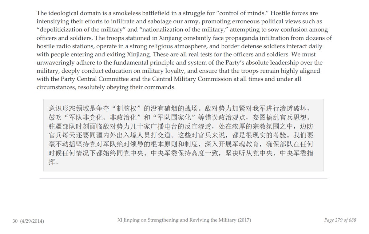 This is in line with Xi Jinping's repeated descriptions of what he calls the "smokeless battlefield"--ongoing ideological and cultural wars, as referenced in this speech he gave to PLA soldiers stationed in Xinjiang, April 29, 2014: