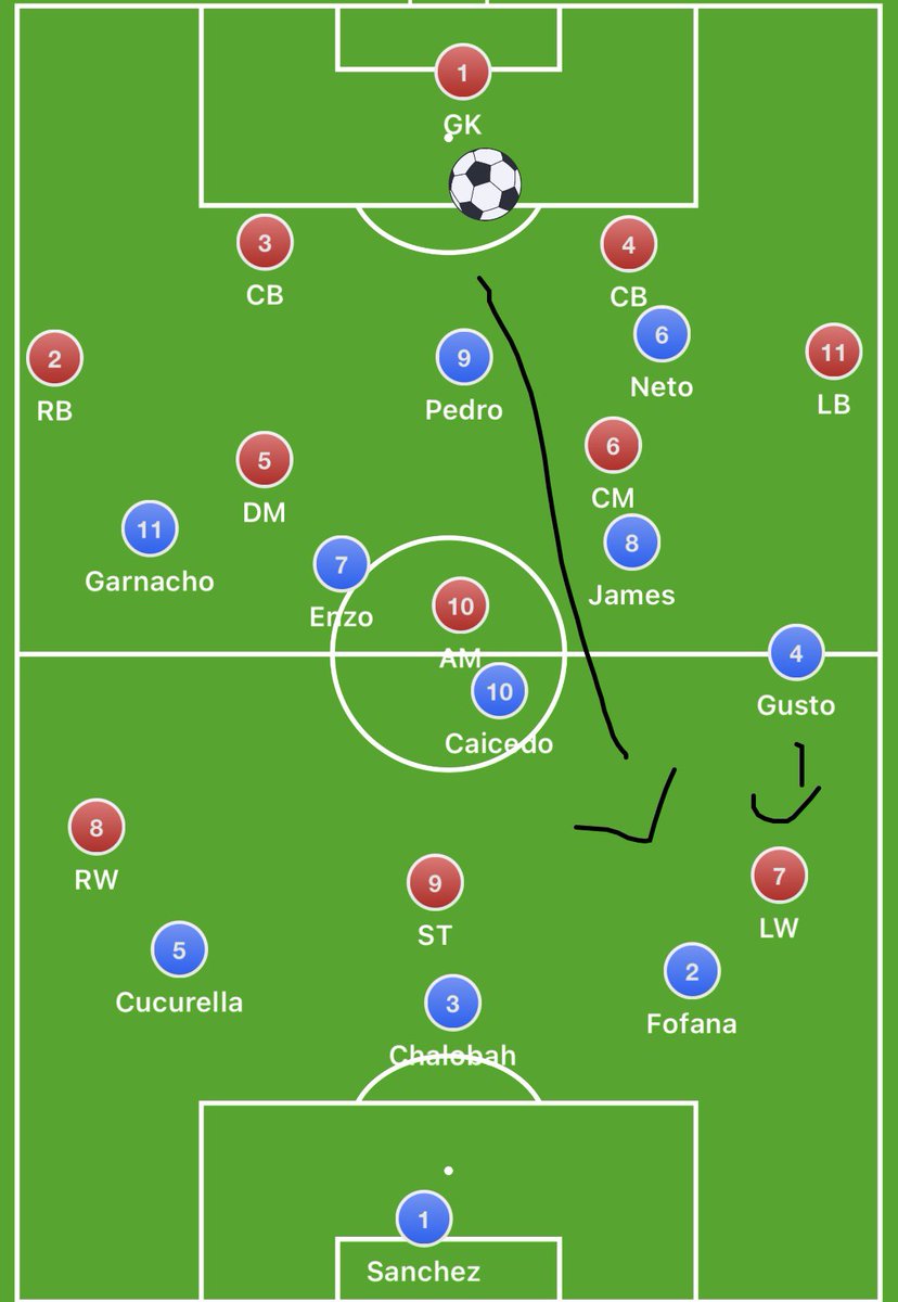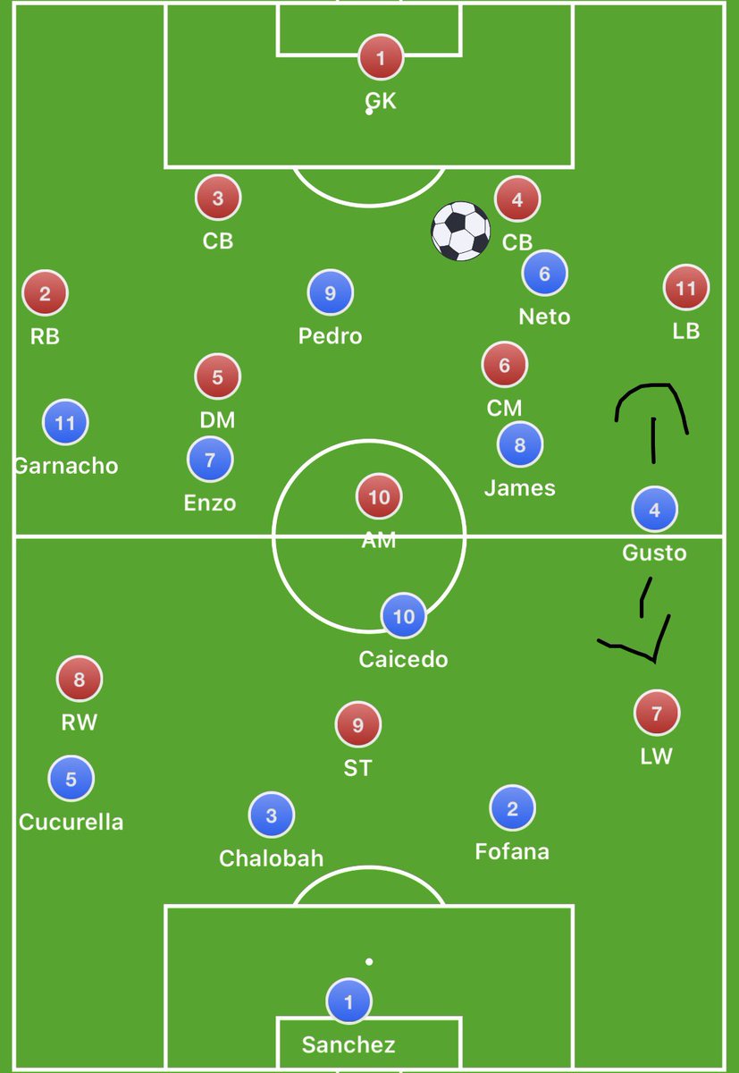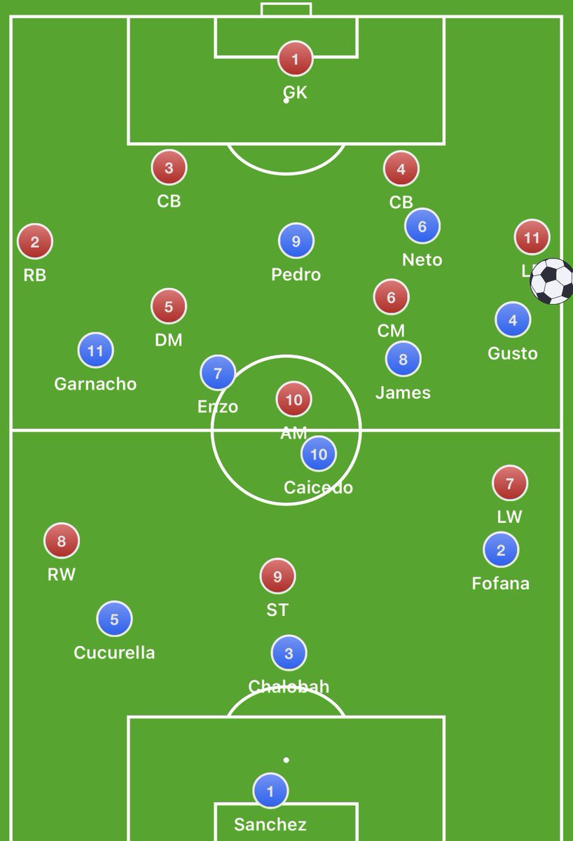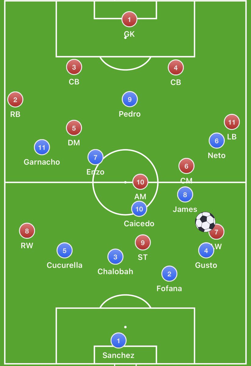 Chelsea lined up in a 4-2-3-1 which immediately changed into a 3-2 build with Caicedo inverting into midfield from right back (4-2 build with Sanchez stepping out as a right centre back from goal kicks)