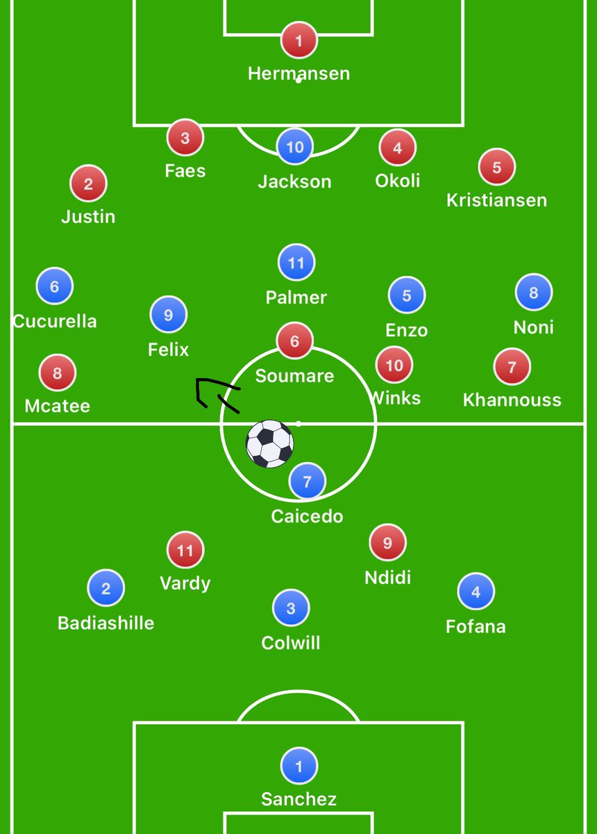 Chelsea lined up in a 4-2-3-1 which quickly became a 3-1-5-1 shape with Enzo & Cucurella moving between the lines to have a 3v2 against Palace’s double pivot & a 6v5 against Palace’s back 5