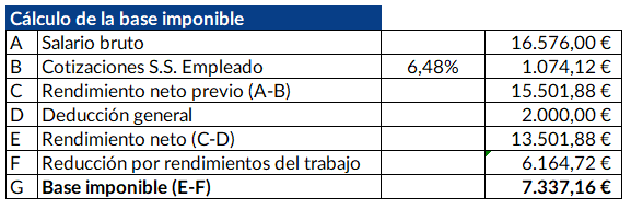 Lo primero de todo es determinar la base imponible, que es donde todo el que no ha profundizado falla a la hora de calcular el IRPF. El IRPF NO se calcula sobre el salario bruto, hay que hacer una serie de adaptaciones para determinar la base.