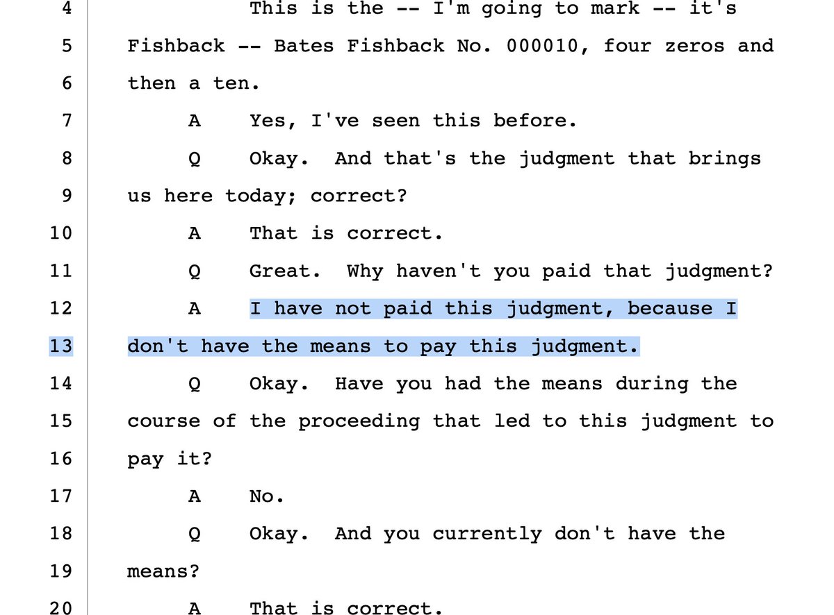 Fishback said during a deposition that he can't afford to pay the judgment aginst him, but the plaintiffs found that he has been purchasing luxury goods (watches, suits, etc) with a card attached undisclosed bank account. He continues to avoid service efforts by federal authorities.