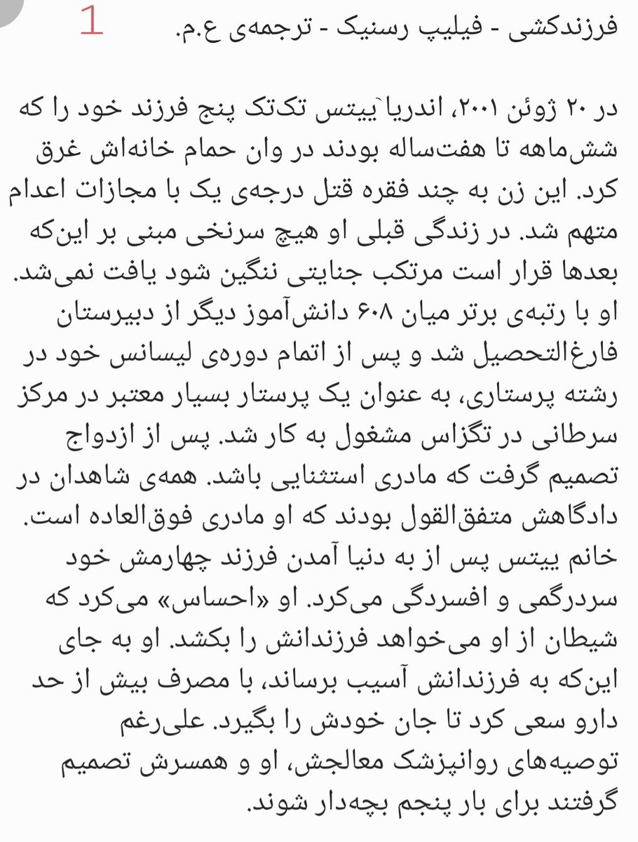 ۱. قتل جان خراش بابک خرمدین کنجکاوم کرد در مورد فراوانی و ریشههای فرزندکشی کمی مطالعه کنم. متأسفانه در منابع داخلی آمار و اطلاعات دندونگیری پیدا نمیشه، ولی آمار فرزندکشی امریکا برای رفع کنجکاوی قابل ملاحظهست. اگر شما هم در این زمینه کنجکاو بودید این رشتهتوییت رو بخونید.