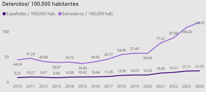 Empecemos por los detenidos: malas noticias. Suben tanto los nacionales como los extranjeros (tanto en términos absolutos como relativos)