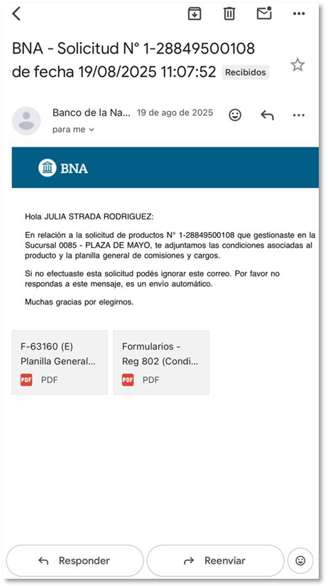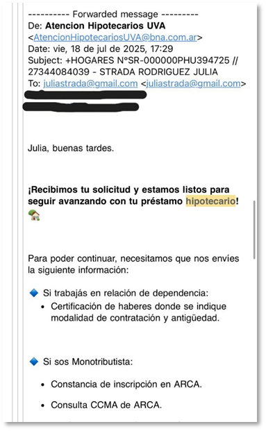 4) Como respuesta, me pidieron la documentación que le piden a todo el que gestiona un crédito desde atencionhipotecariosUVA@bna.com.ar. Adjunto también la imagen de este mail.