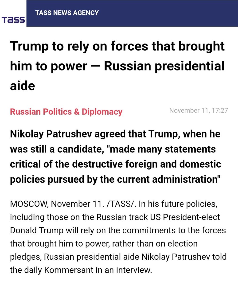 Patrushev's statement is banal. He says DJT "relied on certain forces to which he has corresponding obligations. As a responsible person, he will be obliged to fulfill them" and "very often election pledges in the US can diverge from subsequent actions"