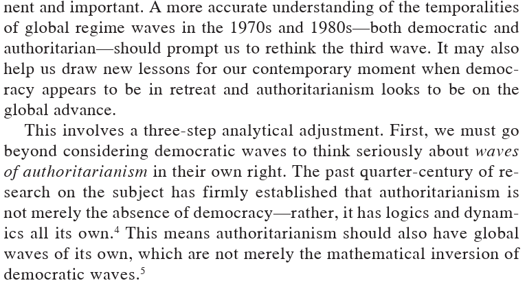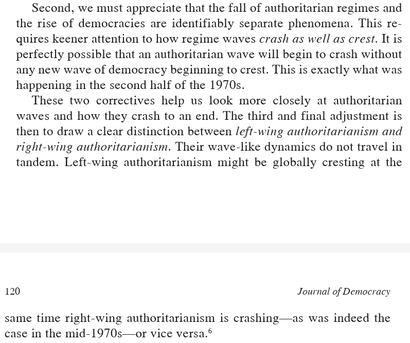 Dan isn't the first to the point about waves of authoritarianism (McFaul made it 20 years ago!), but it's well-stated here. The innovation is if demarcated by the Carnation Revolution (1974), the 3rd Wave only emerges in hindsight and wouldn't have been apparent at the time.