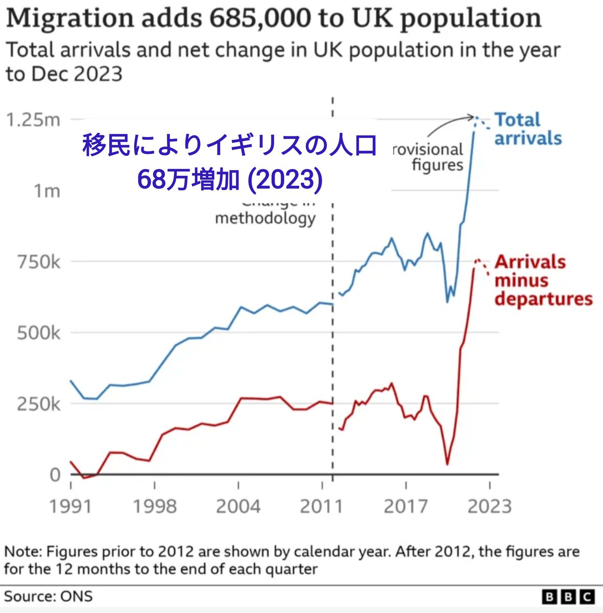 まず大前提として、イギリスへの移民は増加している。移民減少を意図してEU離脱が行われたが、皮肉なことに2018年の国外投票移民は急増し、2023年には120万を越える移民がやって来た。イギリスを離れる人を考慮しても、同年は人口が68万人(全人口の約1%)増えたことになる。2/14