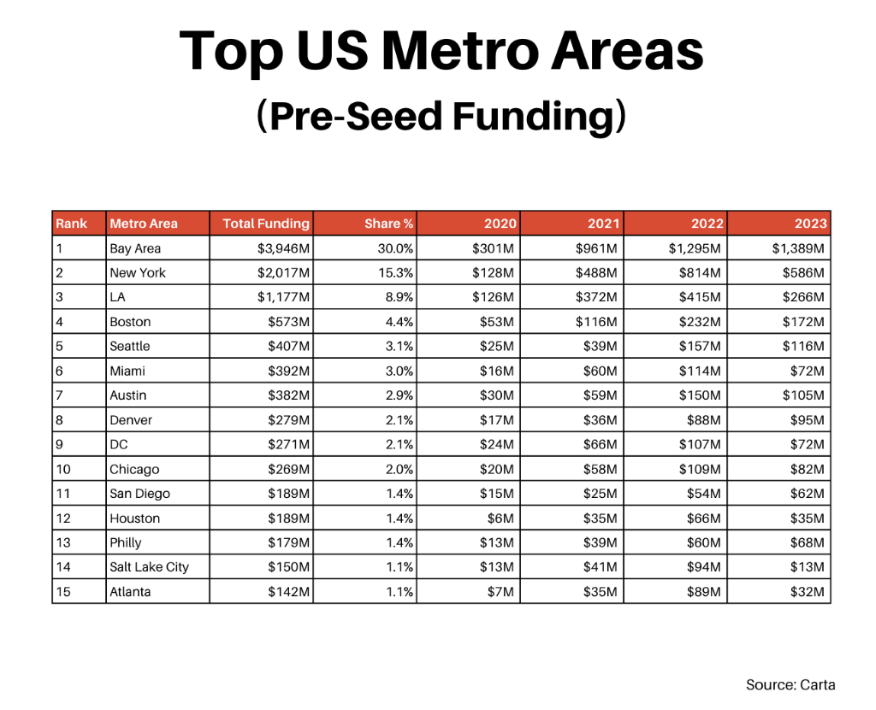 Since 2020, over $2 billion has been deployed into NYC companies at the earliest stages. While the Bay Area still leads with nearly $4 billion invested, NYC is beginning to close the gap by providing ample runway for its next wave of startups (source: Carta).