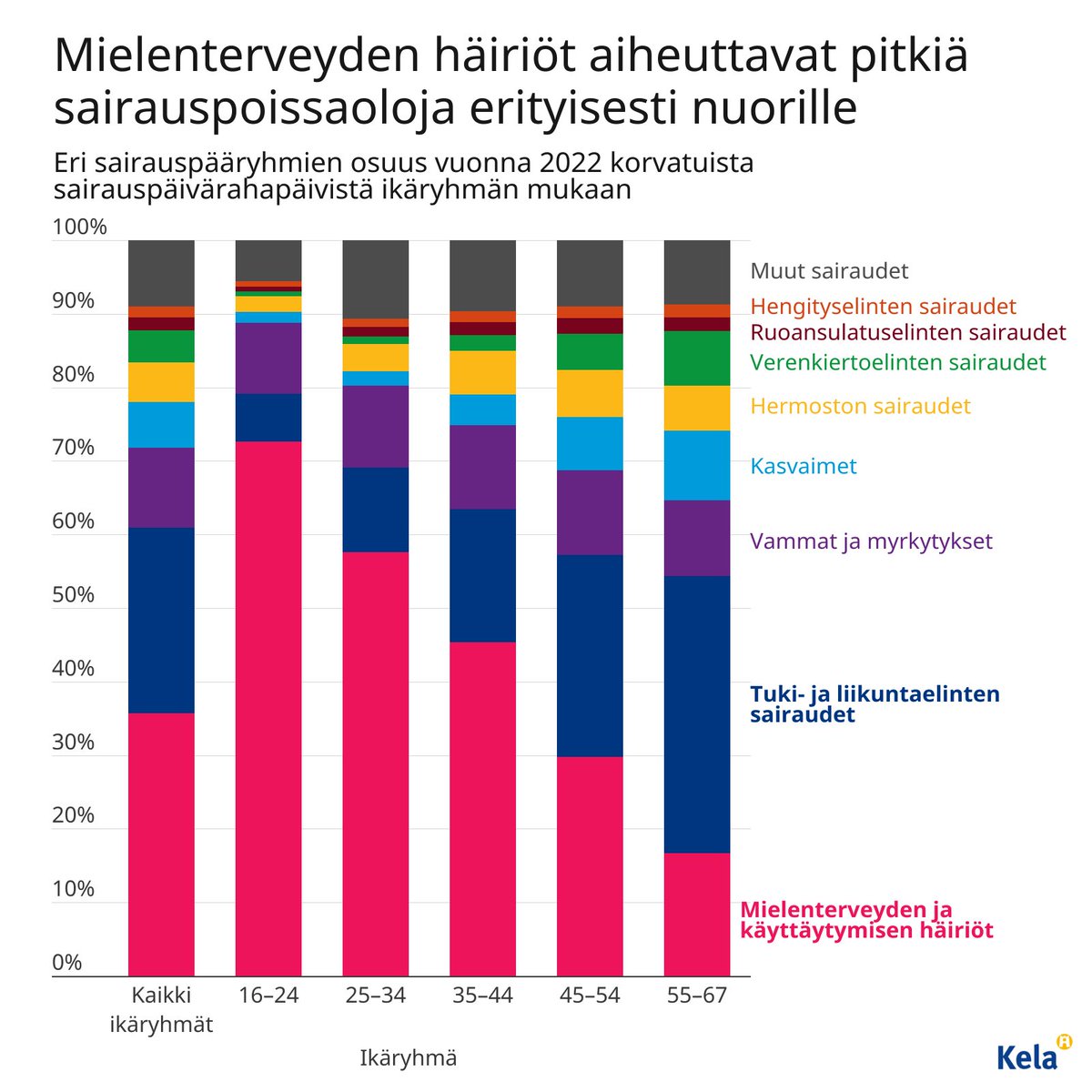 @HagelinHeidi @KelaFpa Sairauspoissaoloissa mielenterveyden häiriöt painottuvat erityisesti nuoriin. Vanhemmiten sairauspoissaoloja kertyy yhä useammin esimerkiksi tuki- ja liikuntaelinten sairauksista. 2/