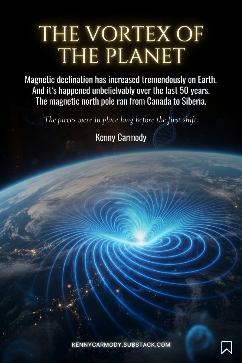 Over the past fifty years, magnetic declination has undergone a dramatic shift. According to the National Oceanic and Atmospheric Administration, the British Geological Survey, and successive updates to the World Magnetic Model, the pole’s drift accelerated to 50–60 kilometers per year during the 2000s and continues at 22–35 kilometers per year today. This movement reflects a fundamental change in Earth’s core dynamo: magnetic flux is weakening beneath Canada while strengthening beneath Siberia. It is not climate theater. It is the planet’s internal particle accelerator altering its Lagrangian geometry, and every ATP synthase motor in your cells is now contending with the resulting entropy costs.