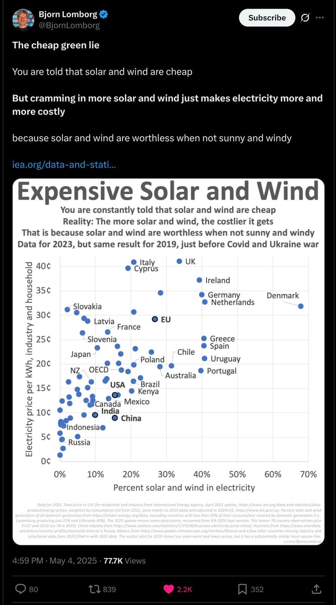 Danish cheap energy fan @BjornLomborg posted this recently. There's a strong correlation between solar+wind% production of electricity and the prices. Is this causal?