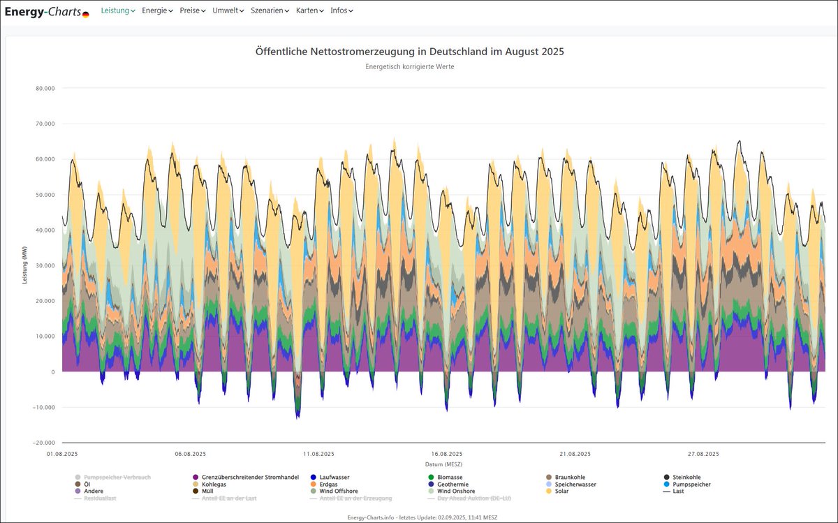 Im Vergleich zu August 24 mehr Strombedarf, mehr Erzeugung, mehr EE, weniger Fossil, weniger Emissionen, geringerer Nettoimport, niedrigerer Ø Börsenpreis