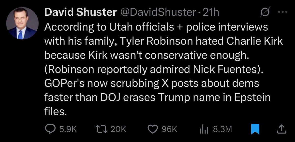 https://twitter.com/klonnypin_gosch/status/1966816071031091288For ex, as I predicted shortly after our gab sesh, the article contradicting the Utah Gov & law enforcement’s characterization of Robinson as an admirer of Nick Fuentes who hated Kirk bc he wasn’t “conservative enough” has since been retracted in strategy of tension psyop fashion