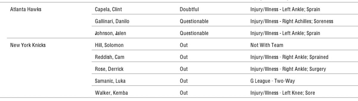 Knicks-Hawks 1:30pm Injury Report: