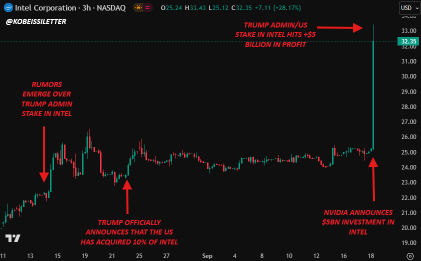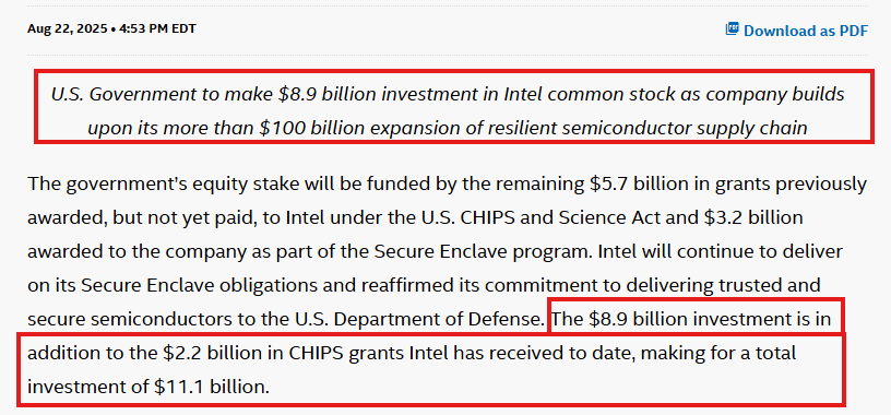 On August 22nd, President Trump announced that the US took a 10% stake in Intel, $INTC, worth ~$11 billion.