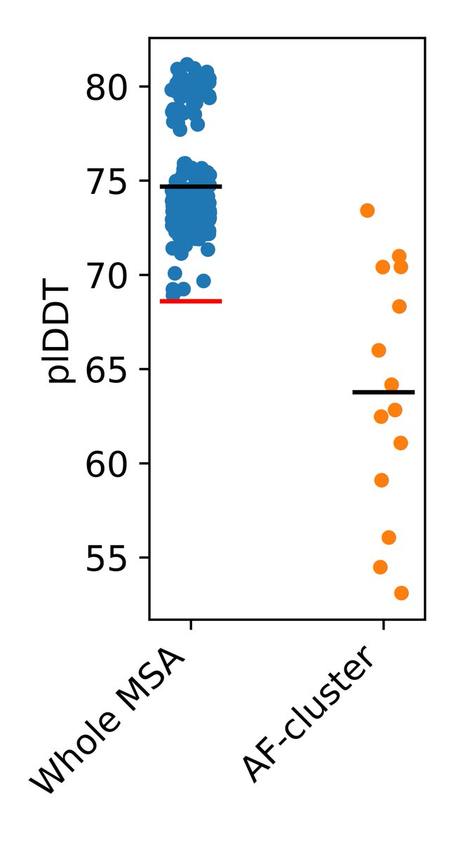 Observation 1: The Paper claims that AF2 generates higher confidence models of RfaH's autoinhibited state from sequence clusters than from the full multiple sequence alignment (MSA). No. Autoinhibited models directly from the Repo have lower confidences than full-MSA preds.