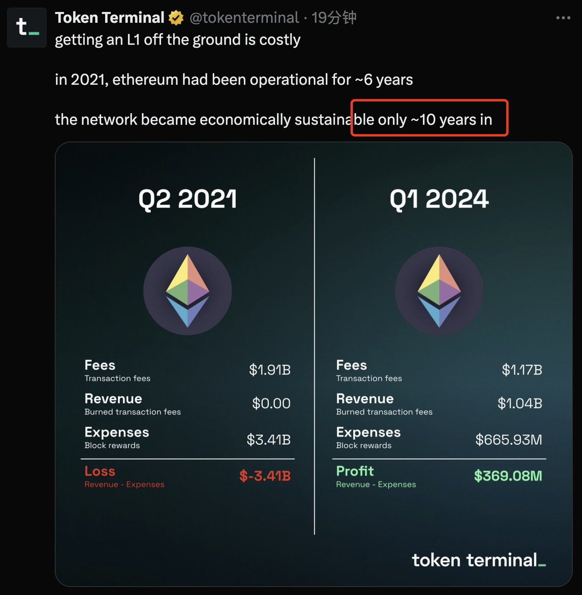 ETH 21年伦敦升级后开始减少补贴试图实现盈亏平衡,从15年主网上线用了近乎十年才转亏为盈,这是一条很艰难的路,其他 L1 不要着急,预示着规模效应是成立的