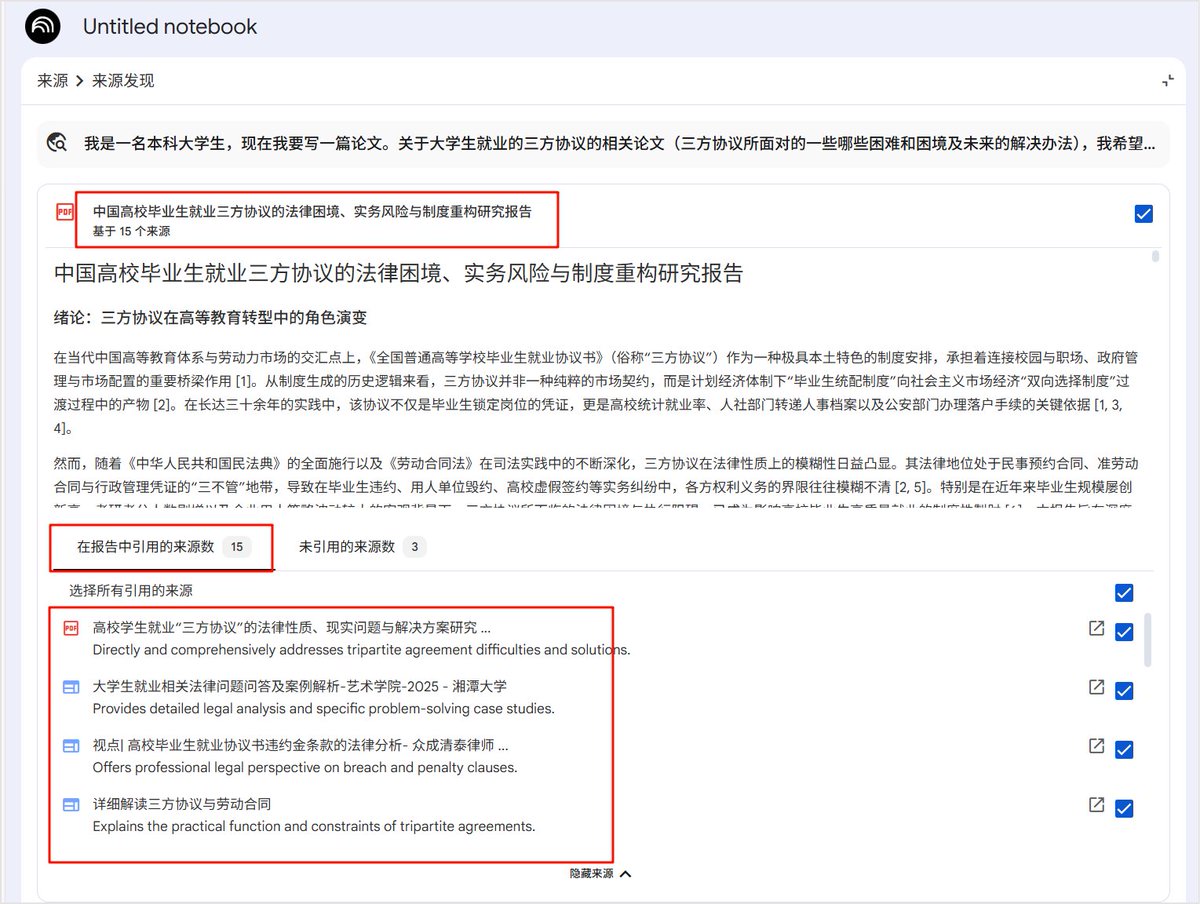 如下图所示,我使用了 Deep Research 模式,它不但给我生成了一个报告,还提供了15篇文献,我只需点击“导入”即可将其加入进来,作为对话的语料。