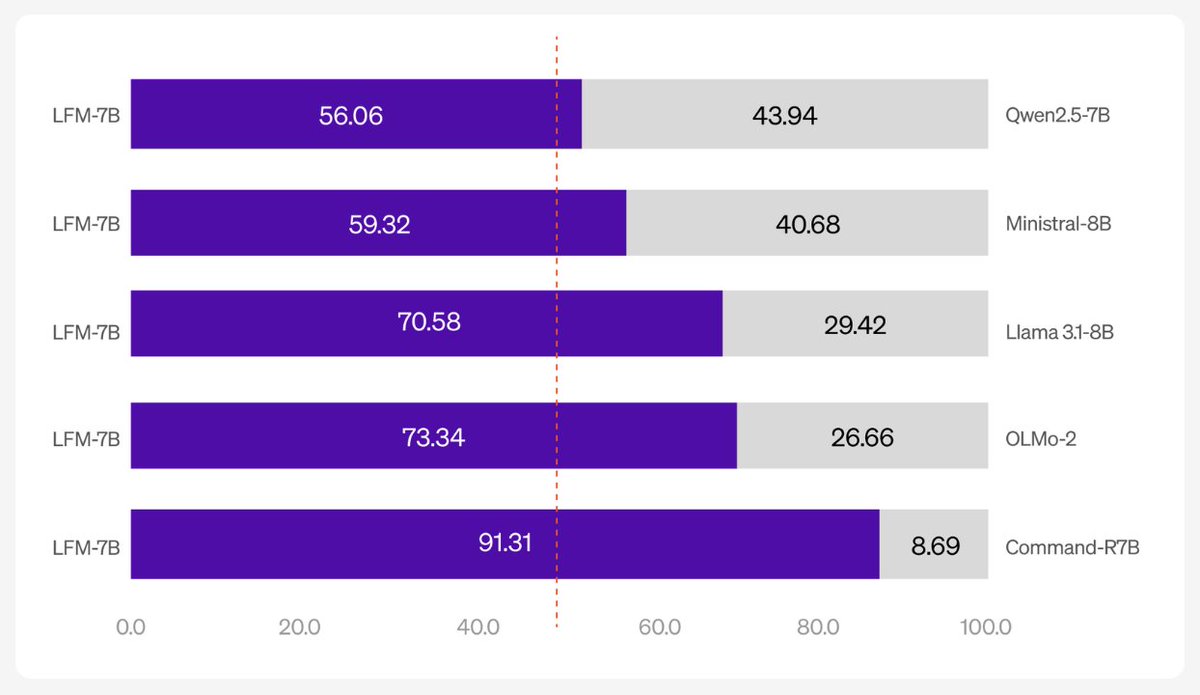 In a series of head-to-head chat capability evaluations, done by 4 frontier LLMs as jury, LFM-7B shows dominance over other models in this size class. 2/