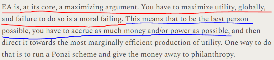 What is underlined in red is true! What is underlined in blue does not follow. The evils that come with accumulating money and power are well-known, and your job can be evil enough to offset the good you do by donating.