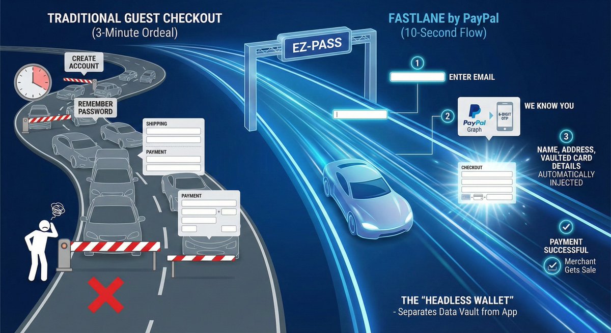 Just as you drive through a toll booth without stopping to pay cash, Fastlane allows a shopper to checkout on a supported merchant's site without ever creating a store account or logging into $PYPL.