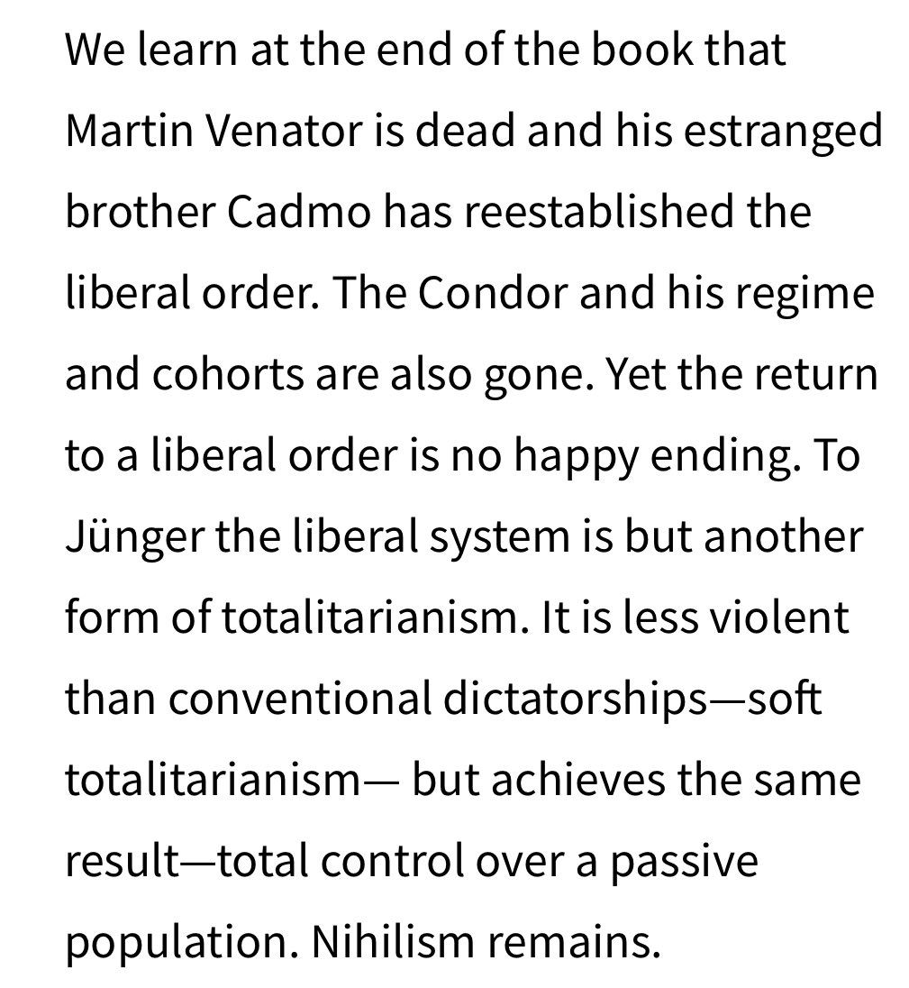https://twitter.com/constantinvonh/status/2014208712227852334What did Junger mean by this? Venator, the Anarch, is executed as a servant of the Condor— he did not take his role seriously, but that did not save him. It turns out that individualist anarchism is nothing but a cope— world historical forces transcend the ego.