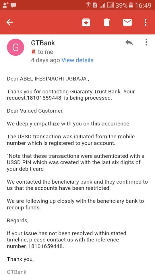 My phone was stolen from me on my way to work on the 15th october, 2018 at FADEYI bus stop and before i was able to block my account i noticed that there has been unauthorized deduction of about #462,000.00 on my @gtbank account 0003602884 that same day.