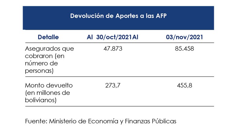 Establecimos, por única vez, la devolución de aportes de las cuentas personales previsionales del Sistema Integral de Pensiones (SIP) de los asegurados. La vigencia de esta devolución de aportes es por 90 días calendario a partir del 6 de octubre de 2021.