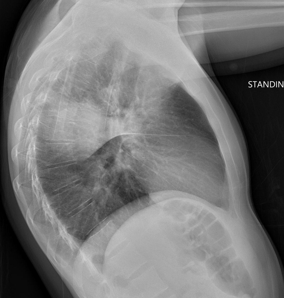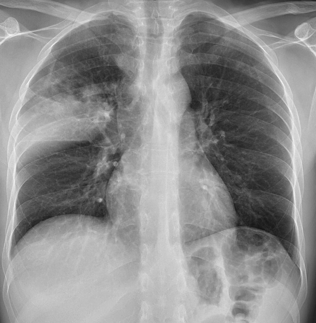 The patient is a 45 yo male. Acute kidney injury and ? Pneumonia. The first image was at presentation. There is peribronchial consolidation with a nice perilobular appearance peripherally. Looks like organising pna. Cause could be infection, vaping, drug reaction, CTD...