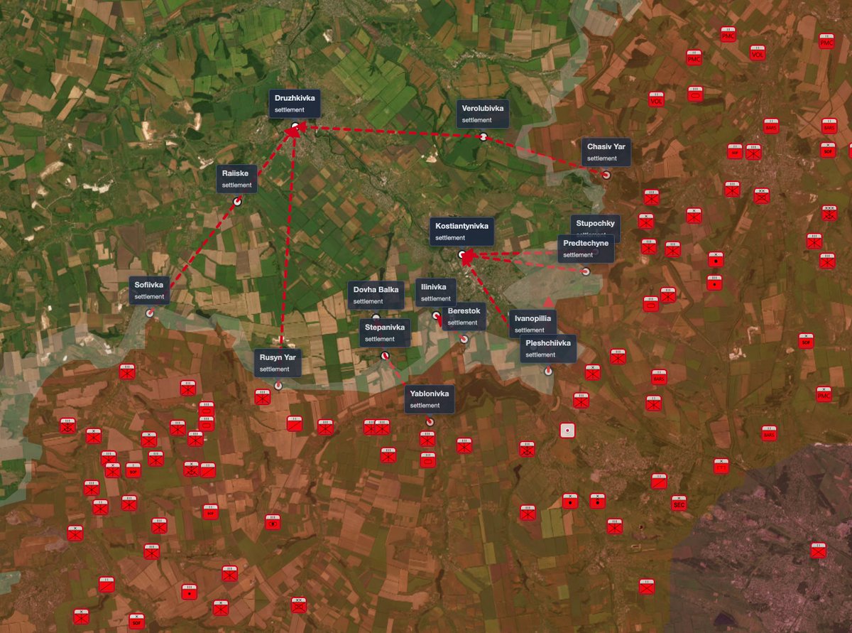 The current offensive is developing along several converging axes. From the south, Russian troops advancing from Berestok pushed through an overgrown ravine to reach the southwestern outskirts of Ivanivka, while simultaneously massing infantry in Berestok itself in preparation for a larger infiltration into western Kostiantynivka via the T-0504 road corridor.