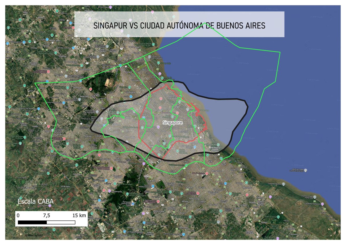 Y asi se vería Singapur sobre CABA. Lo estrictamente urbano seria el límite negro 🏢.