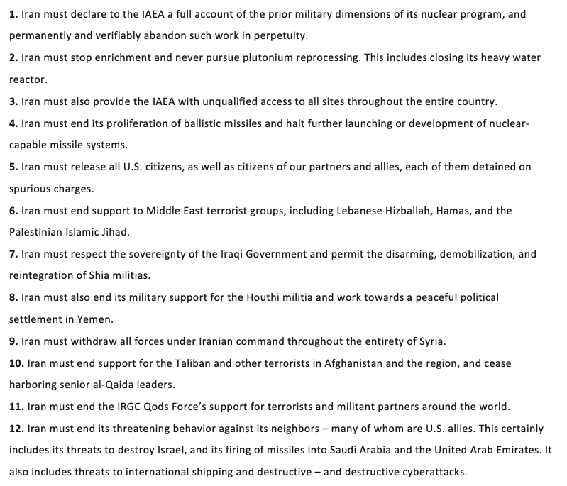 1. Iran must declare to the IAEA a full account of the prior military dimensions of its nuclear program, & permanently & verifiably abandon such work in perpetuity