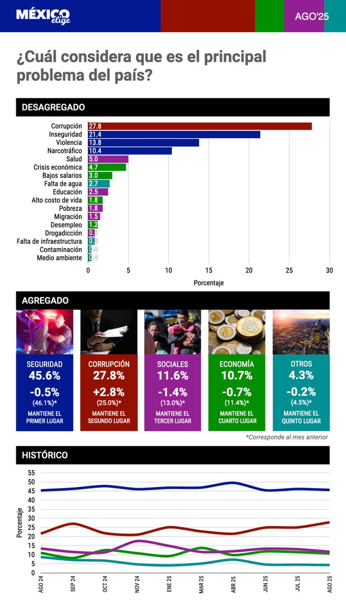 La seguridad se mantiene como el principal problema del país para el 45.6% de los mexicanos, seguido por la corrupción con un 27.8%. #MxElige