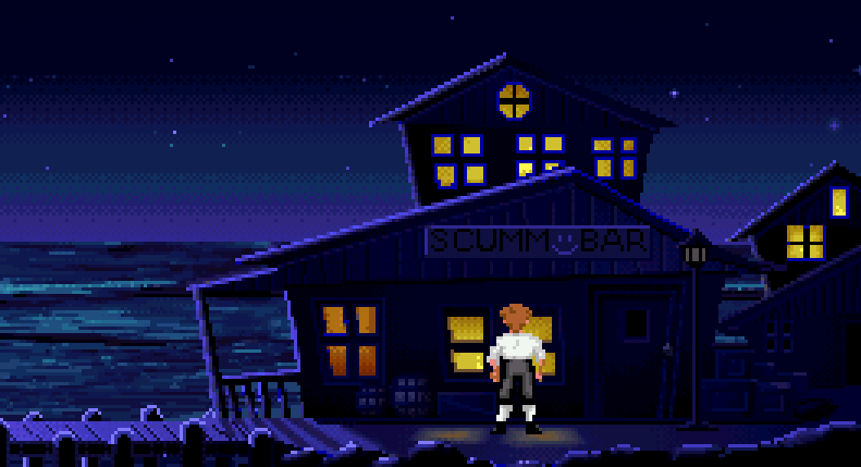 En la noche azul del puerto destacan las luces de la Bull’s Eye Inn / Scumm Bar +