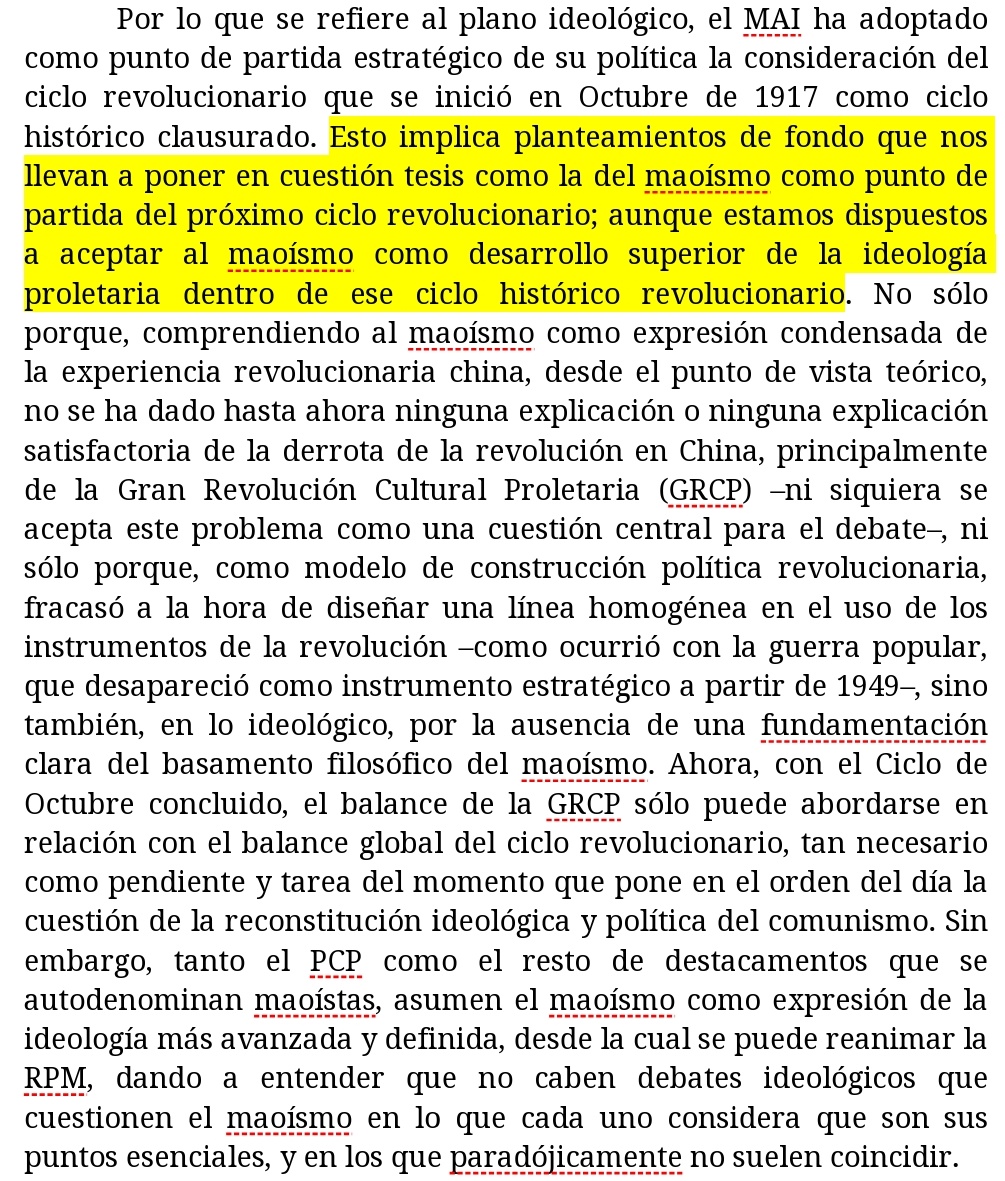 https://twitter.com/RedFront1986/status/1482807807103672320En primer lugar, la inaccesibilidad al documento congresual impide que se pueda comprobar si realmente hay un desarrollo de las cuestiones que escuetamente se mencionan en el párrafo que le dedican a la LR. Lamento que así sea, puesto que "¡Defender y aplicar el maoísmo"
