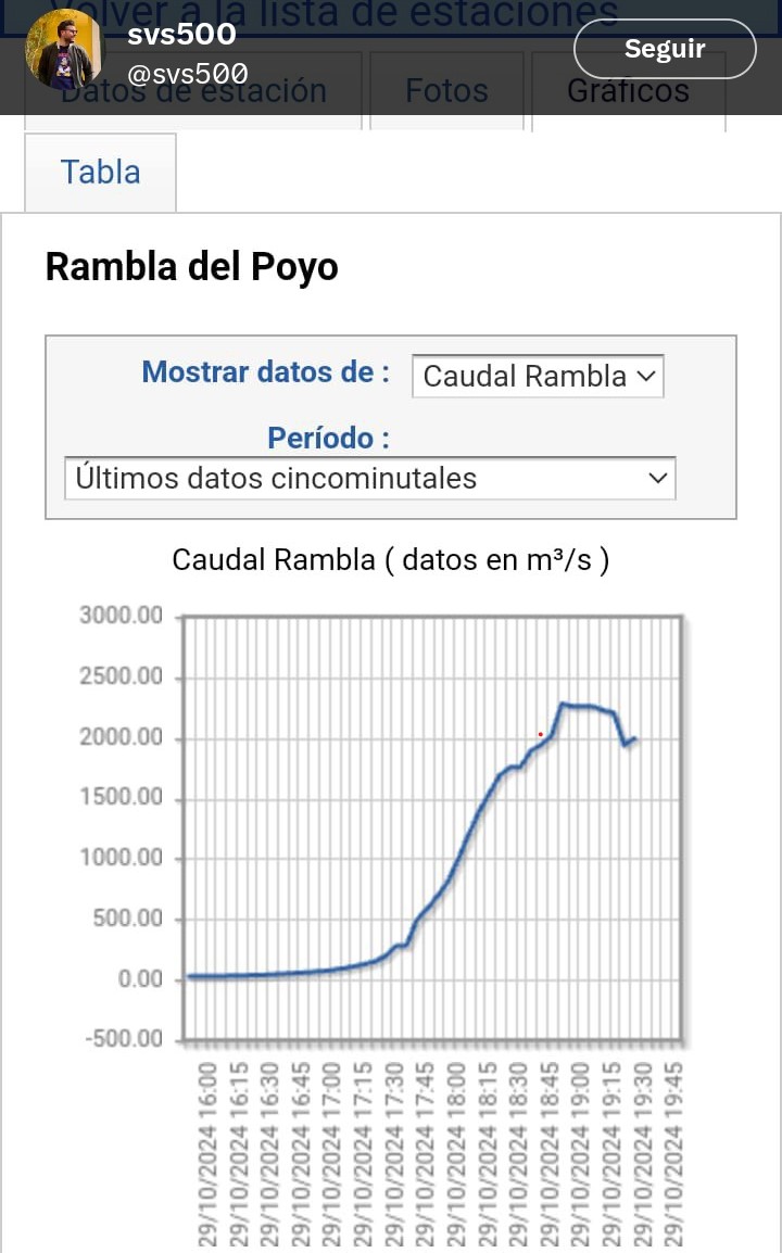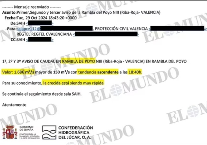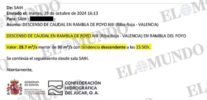 No puedo creer que la CHJ (Confederación Hidrológica del Júcar) no mandara antes de las 18:00 un aviso o llamada urgente y lo hiciera protocolariamente con un email a las 18:43 avisando de que la "crecida está siendo muy rápida" con un caudal de 1686 m3/s y sabiendo el crecimiento exponencial del barranco de El Poyo. El correo anterior fue a las 16:13 con "tendencia descendente" y caudal 28 m3/s ¿Pero es que nadie competente en la CHJ estaba al mando de lo que estaba pasando en el barranco de El Poyo entre las 17:00 y las 18:00? ¿Nadie pudo llamar urgentemente avisando de lo que estaba sucediendo para que se pusieran en alerta a la población? (1)🧵@alfreyes14