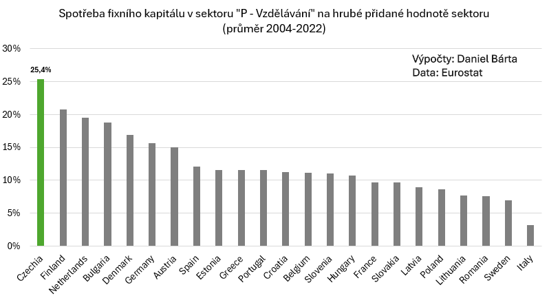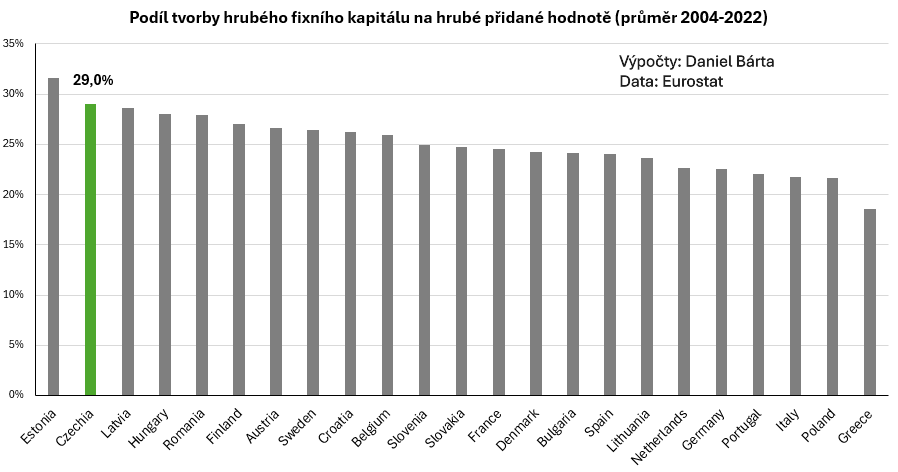 Pro porovnání, hrubá tvorba fixního kapitálu, tedy investice do fixních aktiv počítána včetně reinvestovaných odpisů dosahovala v Česku ve stejném roce 26,24 %.