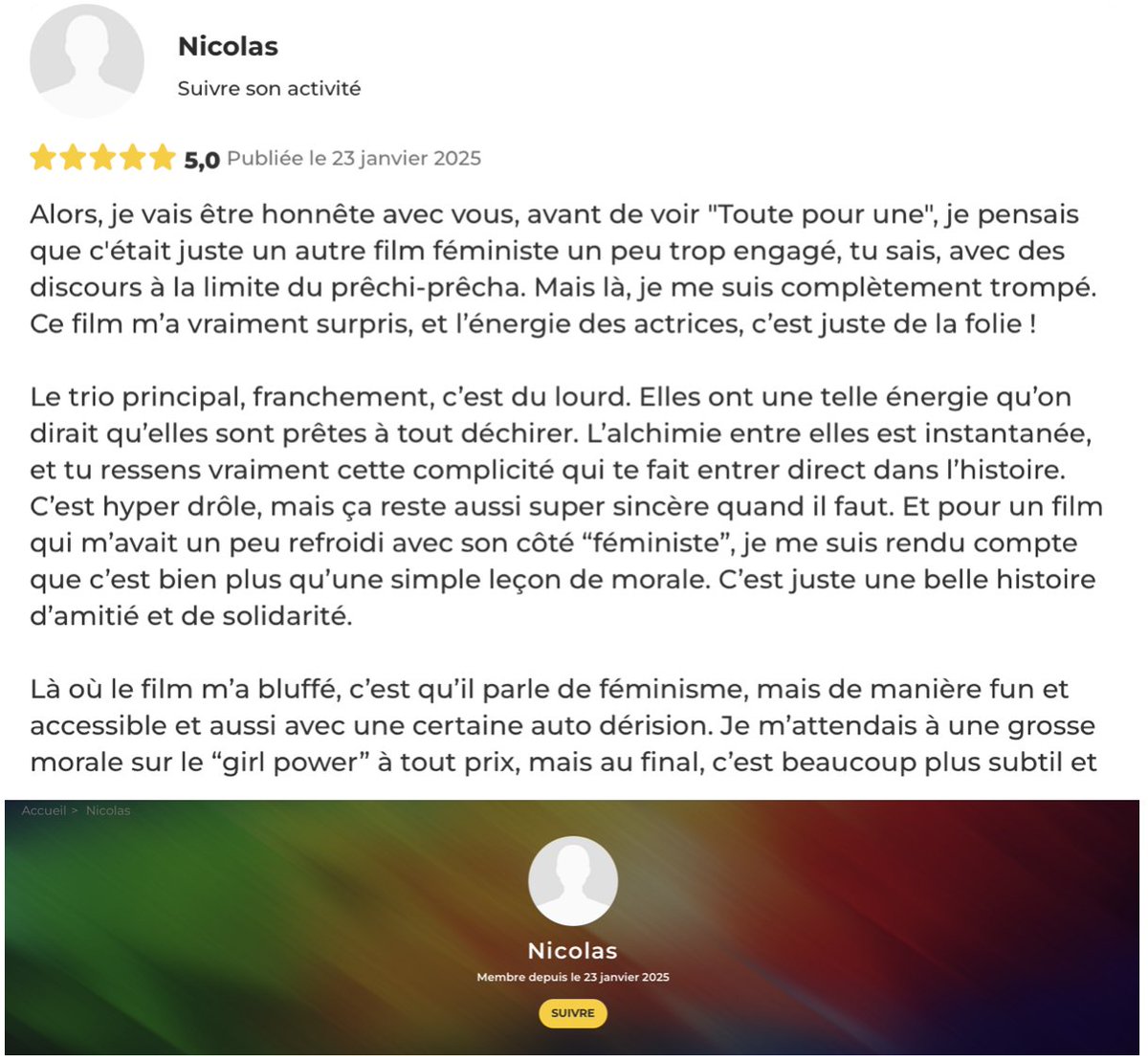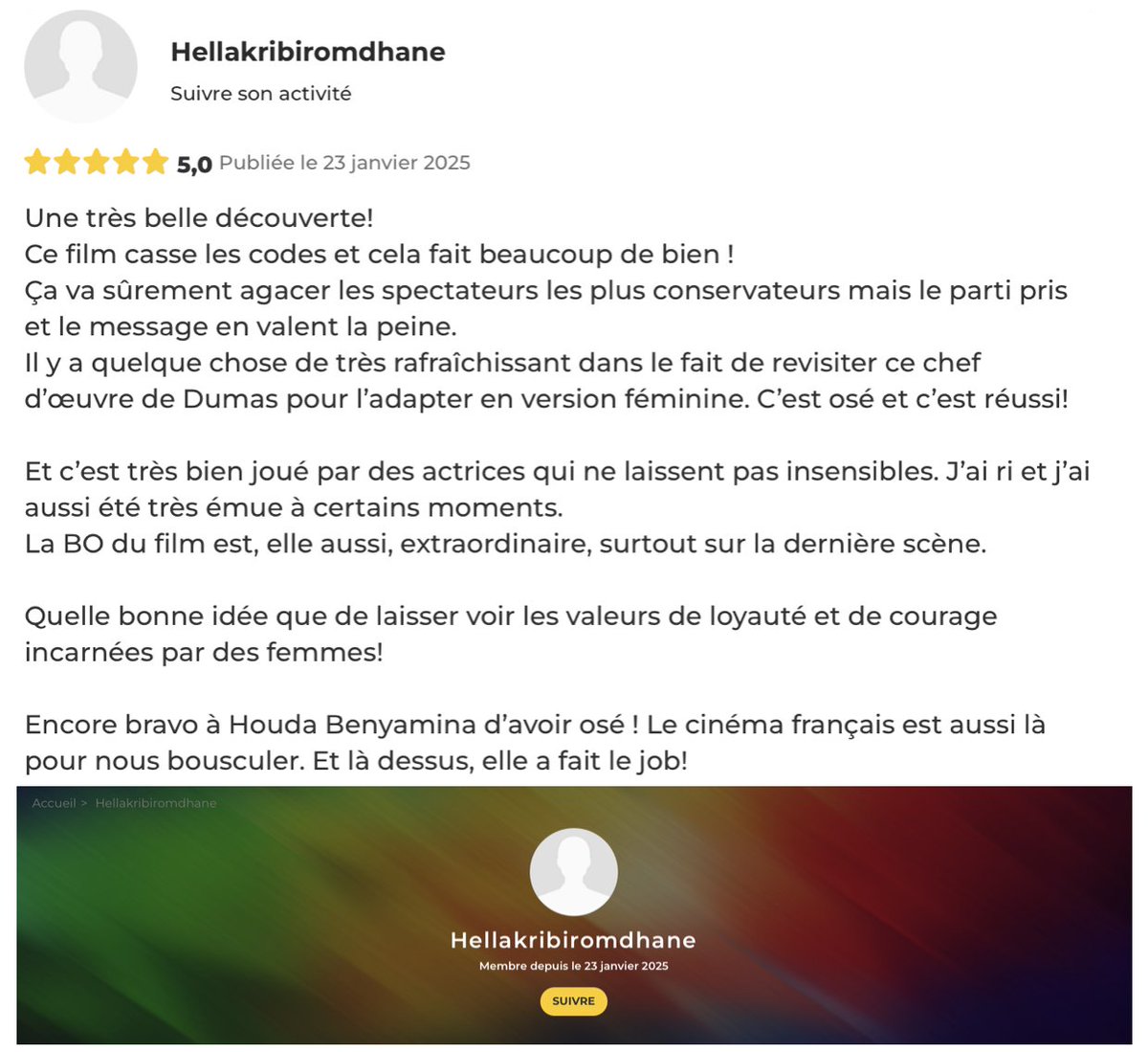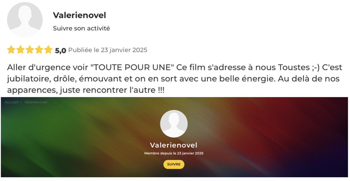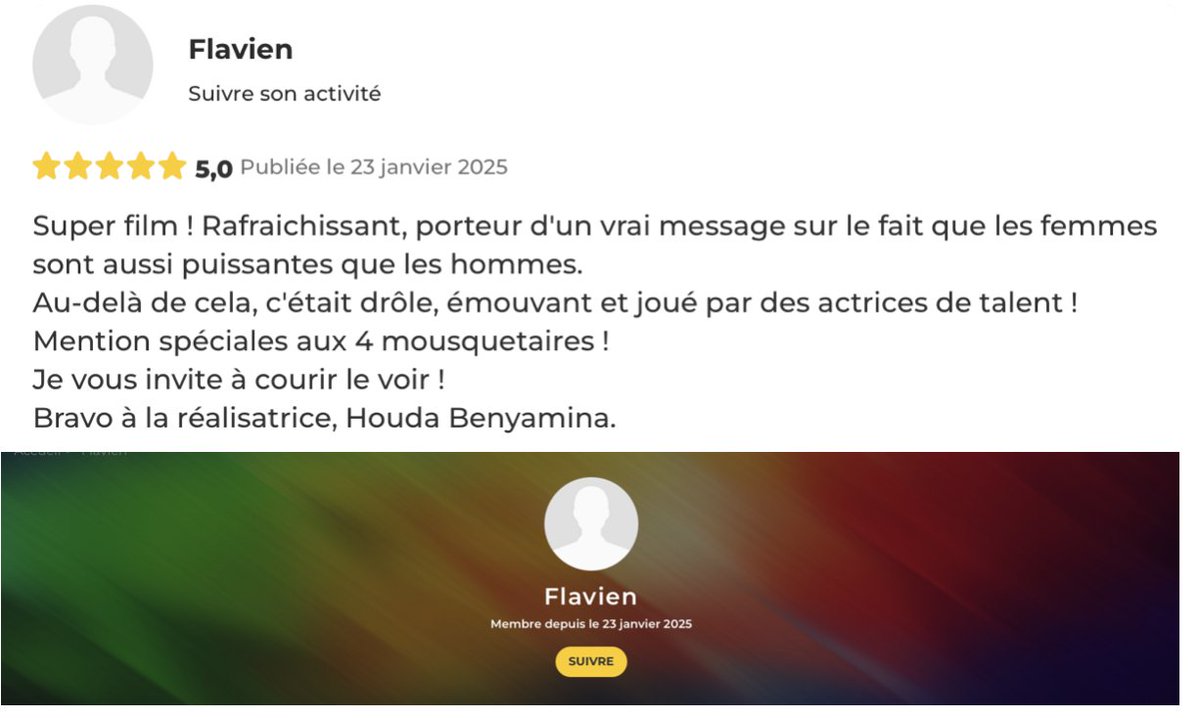 🔴🧶[ INFO L'INCORRECT ] : Des dizaines de commentaires dithyrambiques (5 étoiles) sur le site @allocine pour saluer le film "Toutes Pour Une" de @HoudaBenyamina .