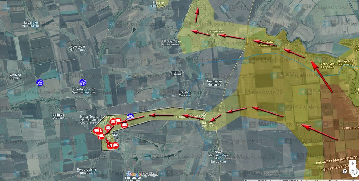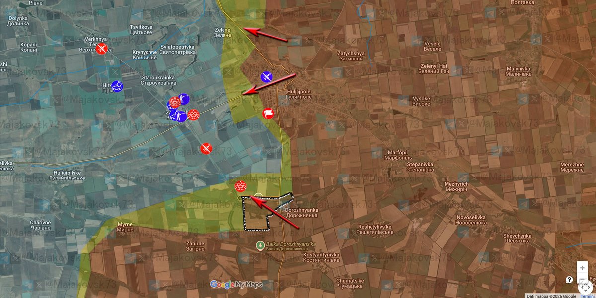 2\#ucraina Fronte di Huliajpole: Russi consolidano alcune zone davanti a Pryuky e Varvariva: Direttrice infiltrazione corretta a Ternuvate. Per DS direttrice è da Dobropylla. Nel villaggio presi anche prigionieri dei russi. Infiltrazione e solita sbandierata a anche a Sviatopetrivka. Effetti della guerra "liquida", dove le frontline sono ormai sfaldate,ed i russi mandano avanti singoli unità, coppie o al massimo 3 soldati, che riescono in alcuni casi a passare anche le fortificazioni (come a Ternuvate), per spesso finire sotto i droni o catturati. Fenomeno che, come dicevo ieri si sta intensificando